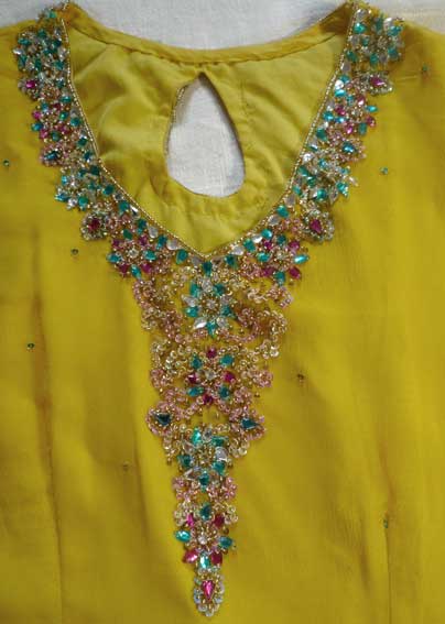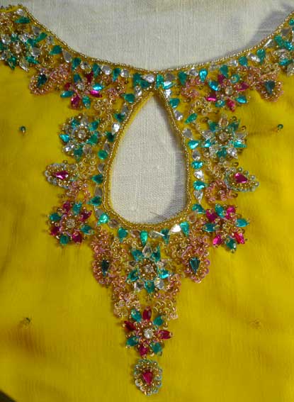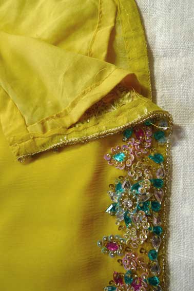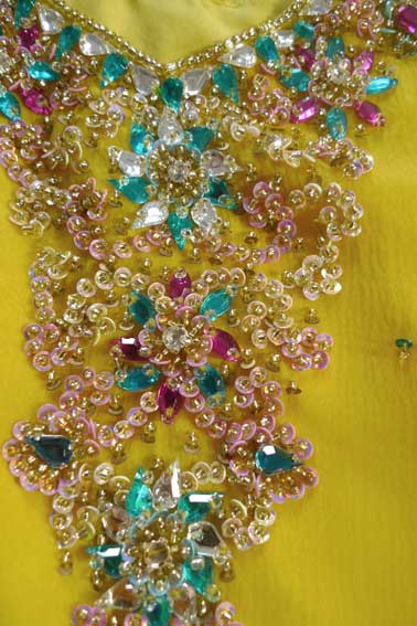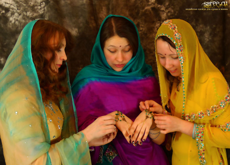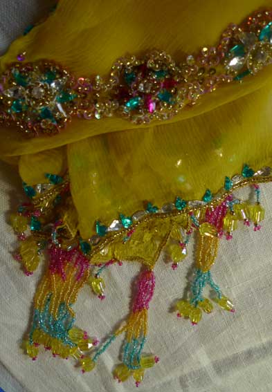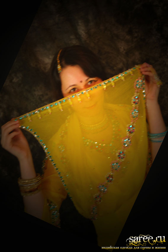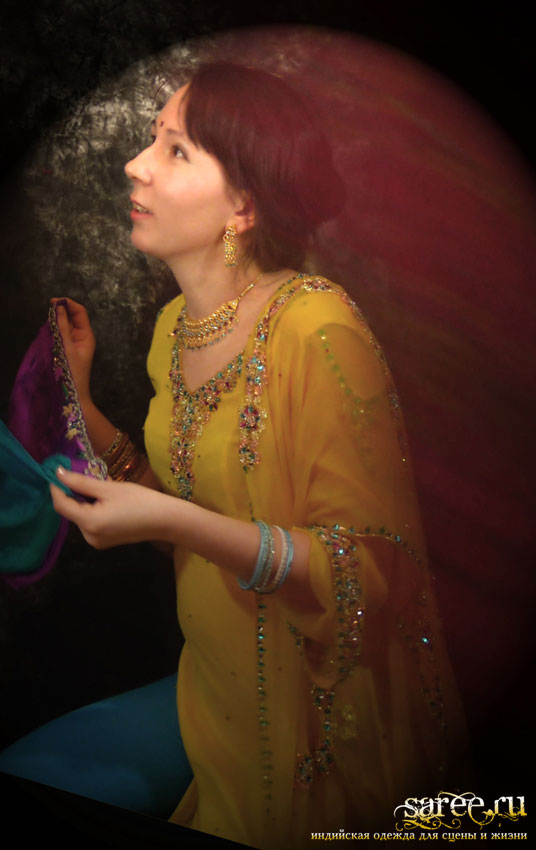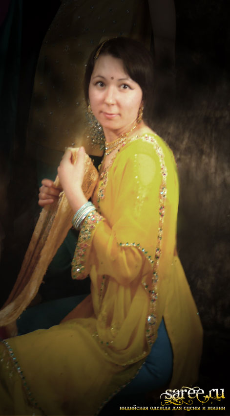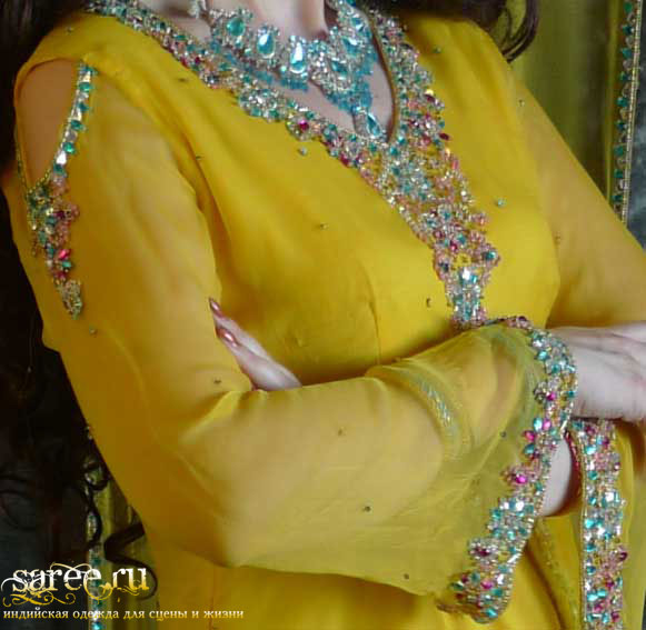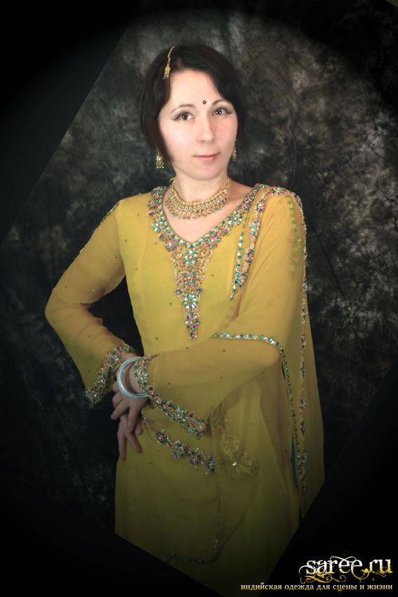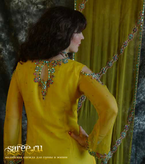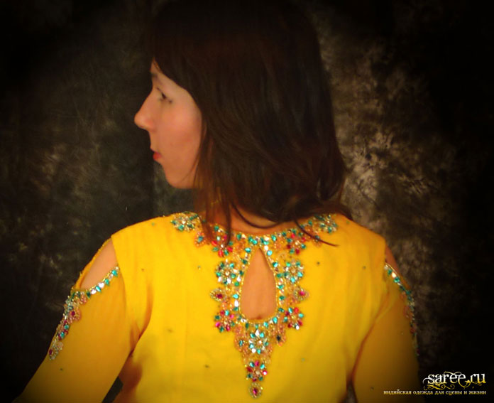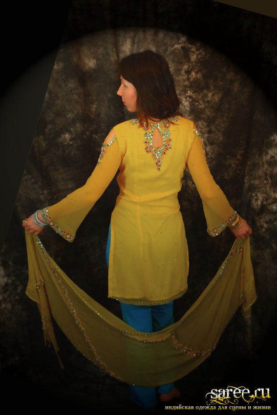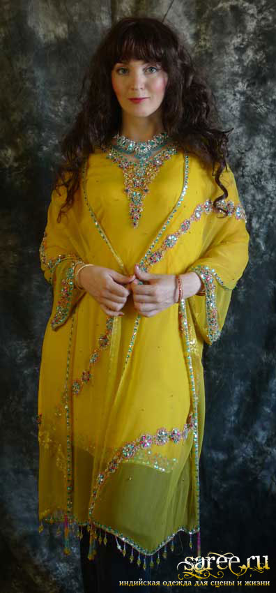 Один из эффектнейших костюмов благодаря яркому светлому цвету, тонкой ткани и дорогой вышивке камнями полностью по всему камизу и шали с кистями. А подчеркнутые вышивкой вырезы на плечах и по спинке вместе с длинными но прозрачными рукавами смотрятся очень даже секси.