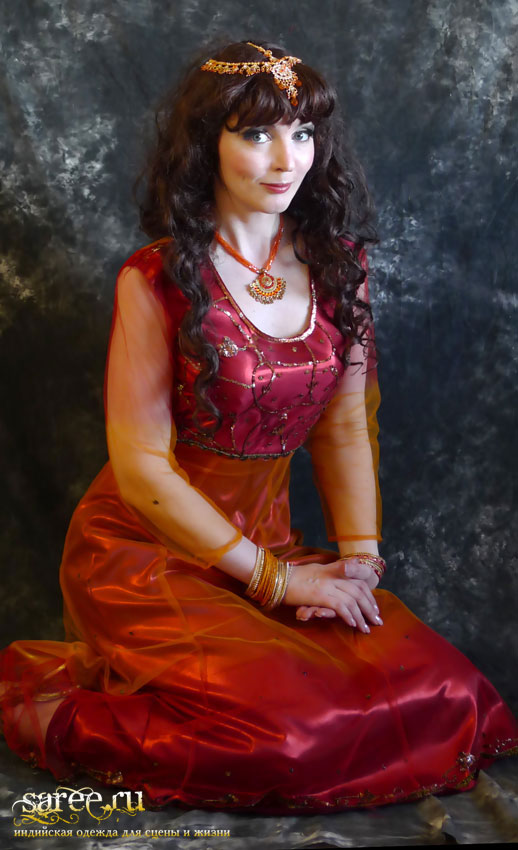 Ткань: Анаркали - мягкая сетка с переходом цветов от темно-красного до апельсинового, нижнее платье и чаридары - атлас с напылением.