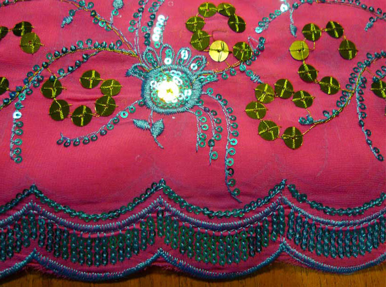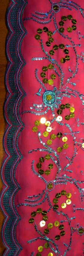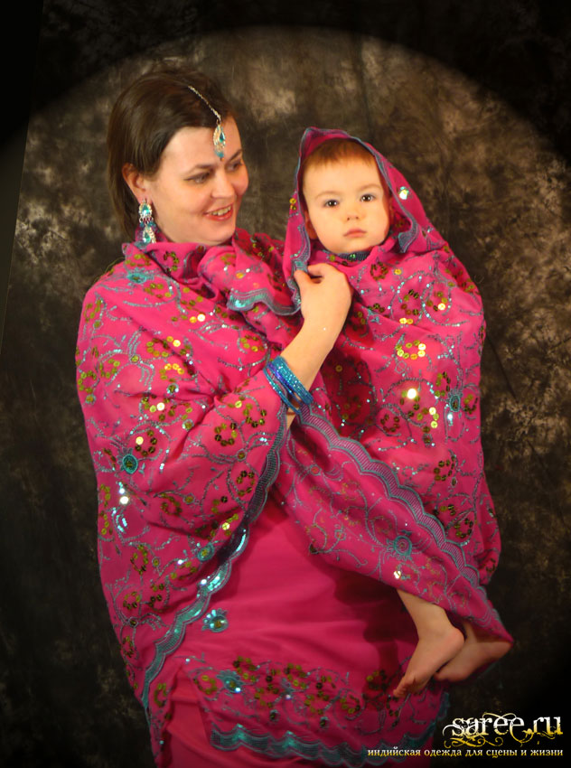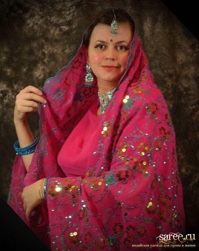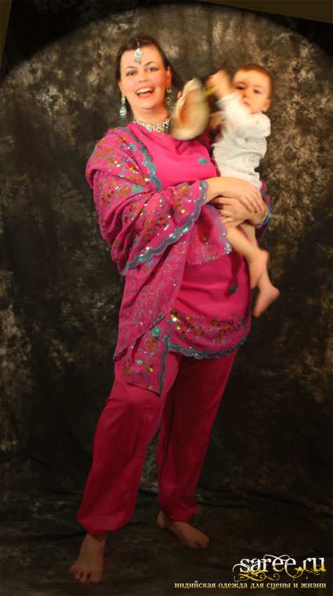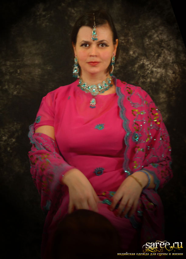 Ткань: камиз - шифон п/э на подкладе, шальвары - шелк. Размеры: 44-58 Цена 2900 руб. Уникальный по вышивке комплект - камиз вышит одинаково спереди и сзади, что почти никогда не встречается в индийской одежде. По подолу камиза вышита полоса с резной голубой каймой, как на шали, а по всему камизу разбросаны небольшие мотивы. Огромная шаль 200х95см имеет 2 резные стороны с голубыми пайетками и полностью вся расшита. Шаровары однотонные. Цвет самый сценичный и эффектный - насыщенная фуксия. Из шали можно сшить топ, платье или даже сценический костюм. |